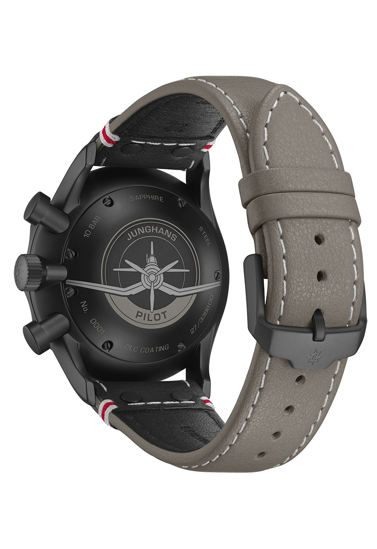 DLC-beschichtet braunschwarz, 7-fach verschraubter Edelstahlboden mit "Aviation" Gravur, Ø 43,3 mm, Höhe 14,4 mm, beidseitig drehbare Lünette