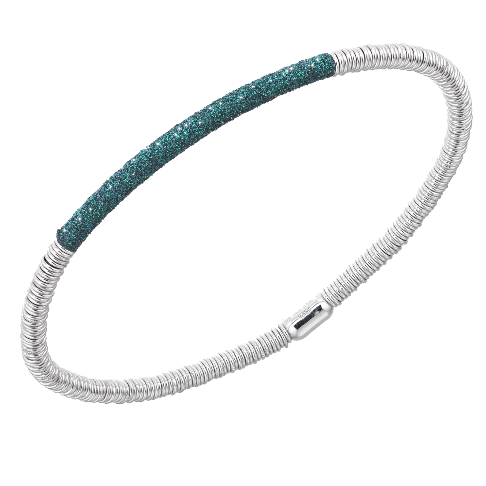 Im Kern ist eine dehnbare Titanfeder verarbeitet um die feine Silberringe angebracht sind. Das Schmuckelement ist fest und mit pulverisiertem Emaillestaub versehen. Die Stärke des Armbands ist ca. 3,5 mm und der Durchmesser ist ca. 6 cm.